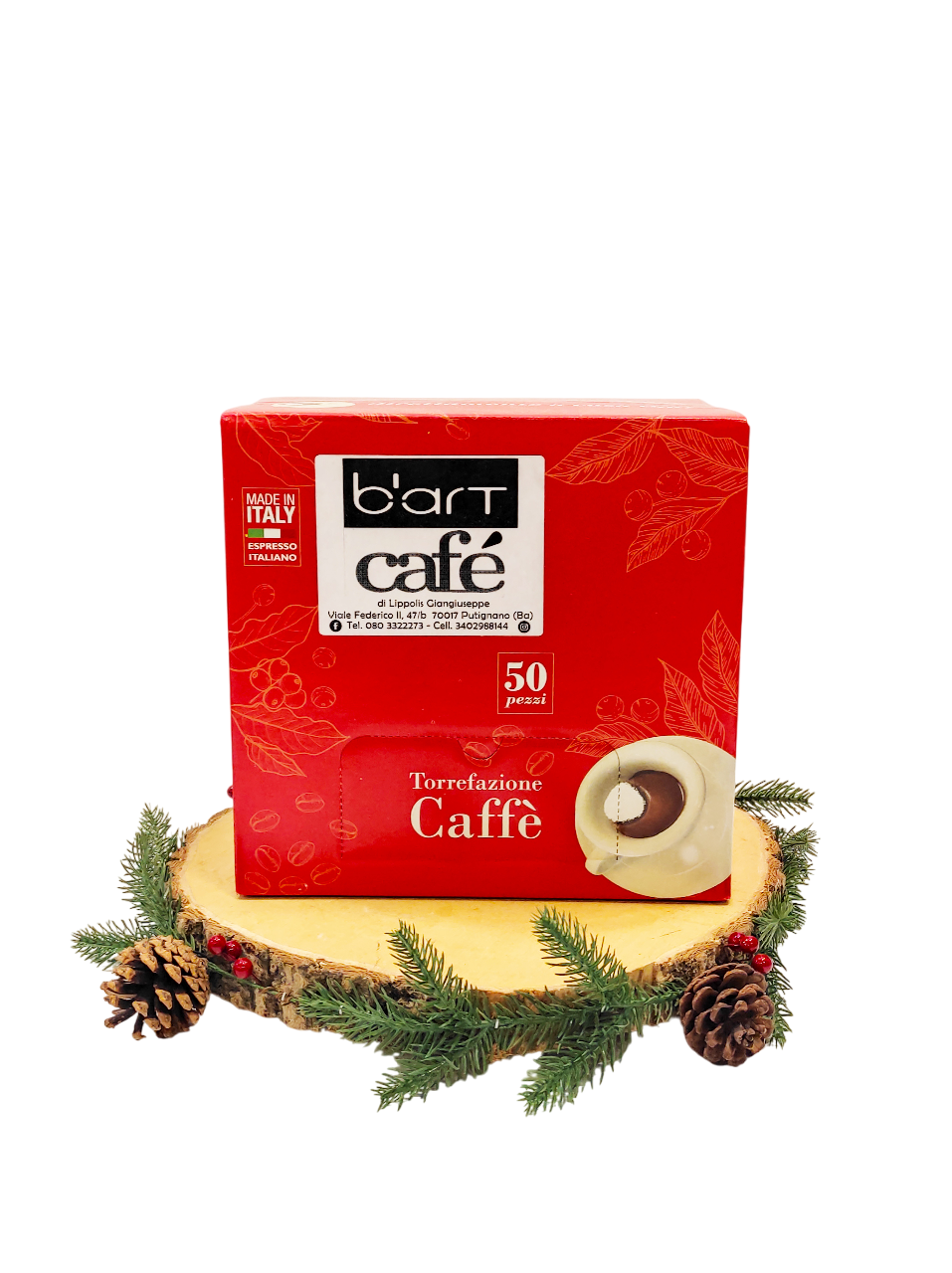 Miscela di caffè Arabica 60 % Robusta 40% tostato artigianalmente da Bart Cafè in confezione da nr. 50 capsule.